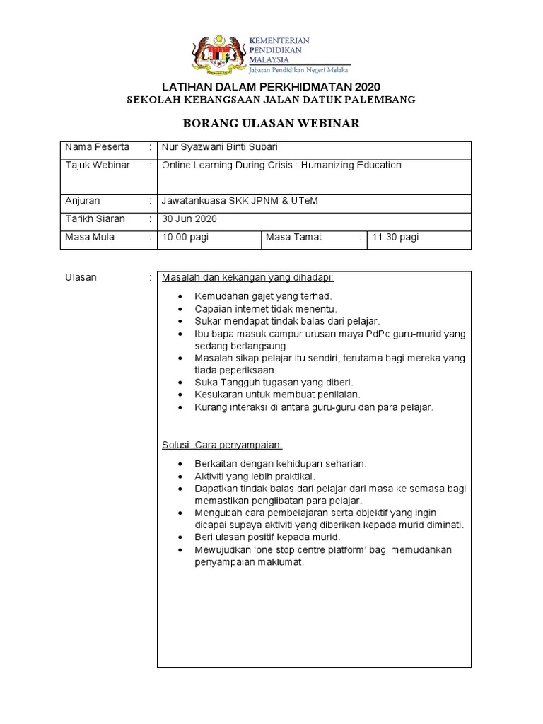 Borang Ulasan Webinar Utem Online Class Humanizing Education Pdf